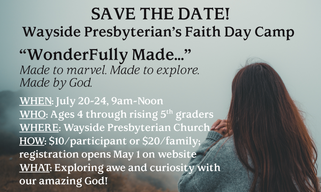 Vacation Bible School for 4-year-olds through rising 5th graders is held yearly in July. Register online here.